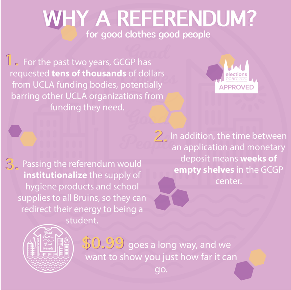 While coronavirus may be keeping us at home, life goes on. During the recent UCLA USAC election, GCGP UCLA waged a successful campaign leading to the passage of the GCGP Basic Needs Referendum. The referendum, which passed resoundingly with 75% voters in approval, asked for an increase of $1 in annual school fees per student to fund GCGP’s provision of hygiene and school supplies for any UCLA student in need. The passage of the referendum provides $25000 for GCGP’s redistribution initiative and institutionalizes the provision of hygiene products and school supplies at UCLA .